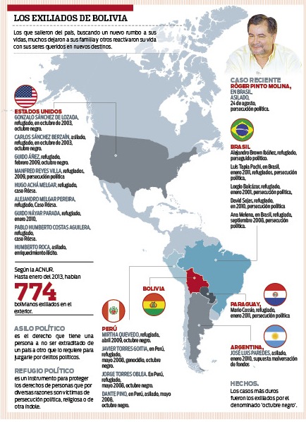El número de exiliados políticos continúa engrosándose. El senador opositor Róger Pinto, que salió del país el fin de semana pasado, es el nombre que se suma a esta lista. En los últimos diez años, la cifra de los exiliados bolivianos aumentó de manera considerable. Según, un informe del Alto Comisionado de las Naciones Unidas para los Refugiados (Acnur), existían hasta enero de 2013 un total de 774 bolivianos exiliados. Sin embargo, esta cifra data, desde muchos años anteriores, incluyendo la declaratoria de estado de sitio y remarcando la militarización del departamento de Pando, dictada por el actual gobierno en el 2008. Este número sirve para medir el régimen del actual gobierno, al que opositores consideran como "autoritario", dado que desde que Morales está en el cargo, los exiliados en su gestión son más de 300 bolivianos.